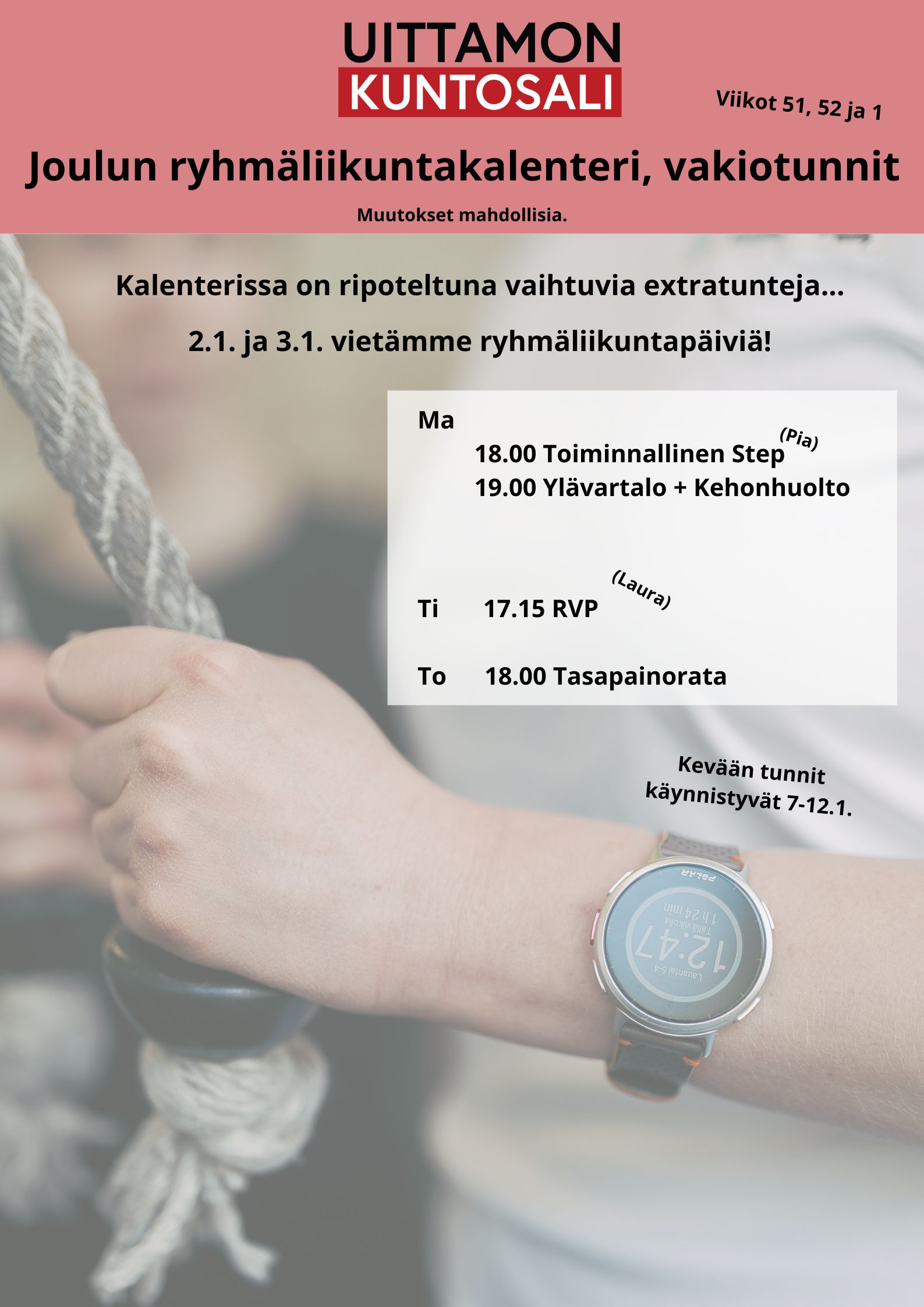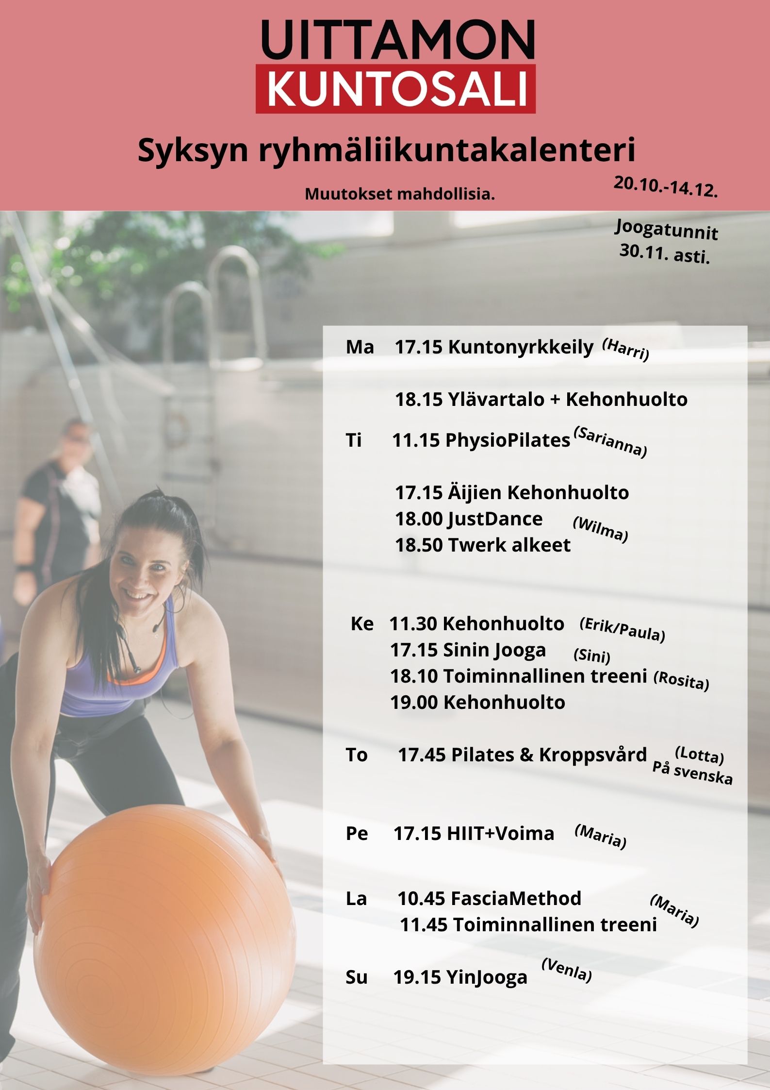 Torstaisin meillä on uutuutena ruotsinkielinen tunti! Lotta ohjaa lempeää pilatesta ja kehonhuoltoa. Tervetuloa mukaan kertamaksulla tai salikortillasi!
